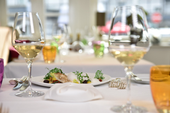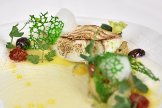 Der gut temperierte Weißwein vermag den Gaumen nachhaltig zu erfreuen und korrespondiert elegant mit den Speisen. Die gelungene Einstimmung auf das Hauptgericht: Ein Stück vom Glattbutt auf einer Brandade aus Artischocken und Eissellerie, gerundet mit Kapern und Oliven. Mit feiner rauchiger Note zergeht das zarte Filet auf der Zunge, Beeren-Gelee und feine Tomatenscheibchen runden das Erlebnis mit frisch-fruchtigen Akzenten ab.